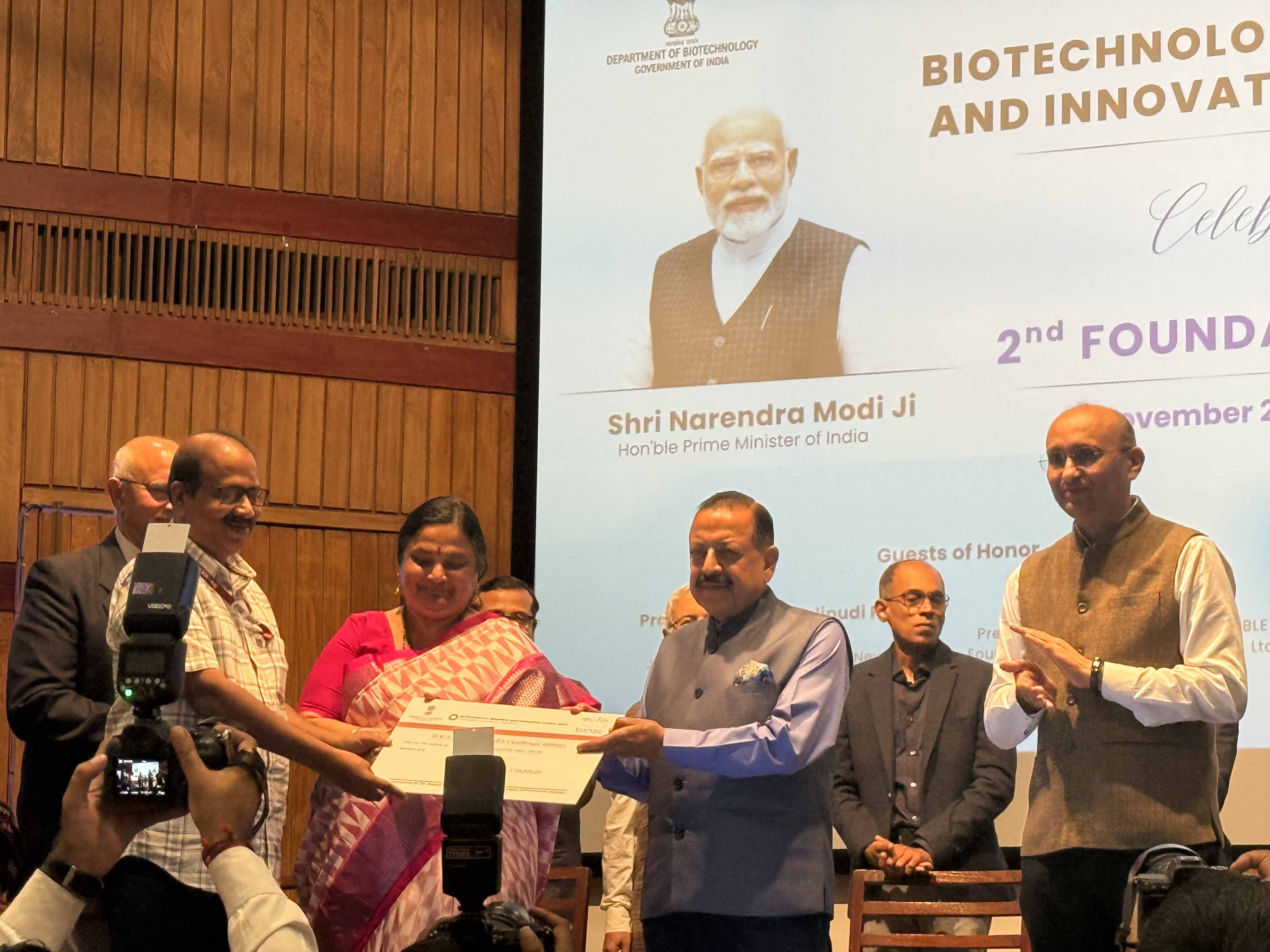 The Bio E3 DESIGN proposal submitted by Ms.Aishwarya Iyer, MSc 1st year student was selected among the top 10 proposals by BRIC. Over 500 proposals were submitted from different iBRIC institutions. This was announced today during the 2nd BRIC foundation day celebration at BRIC-NII. New Delhi. Dr T R Santhosh Kumar, Director (Additional charge), received the cash prize of Rs.10,000 from Dr Jitendra Singh (Hon Minister, Science and Technology, Government of India) on behalf of Aishwarya.